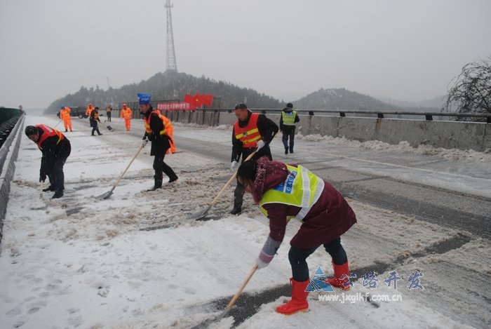 (图为杨梅岭管理处破冰除雪保畅 李慎国摄)险情就是命令,梨温高速迅速成立了党员、团员抗冰保畅突击队,相关负责人深入铲冰除雪的现场,加强现场指挥调度,实时掌握道路状况和工作开展情况,针对容易结冰的长坡、特大桥、互通立交等重点领域,进行除冰撒盐、抛洒融雪剂、铺垫编织袋,有效防止了路面结冰打滑,让过往司乘快速安全通行。