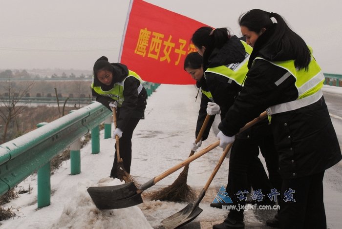 除了这些巾帼不让须眉的鹰西姑娘们,还有梨温高速公路鹰潭管理处抗冰雪应急工作组120人,手持铁铲、身披反光衣,不分昼夜,每隔两小时分批轮流上路挥舞着除雪铲、挥洒着融冰盐,为过往车辆清扫和维护着一条安全畅捷的通道。