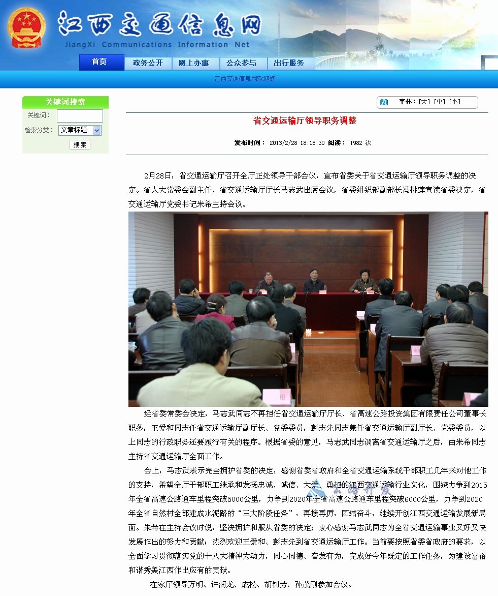 2月28日,省交通运输厅召开全厅正处领导干部会议,宣布省委关于省交通运输厅领导职务调整的决定。省人大常委会副主任、省交通运输厅厅长马志武出席会议,省委组织部副部长冯桃莲宣读省委决定,省交通运输厅党委书记朱希主持会议。