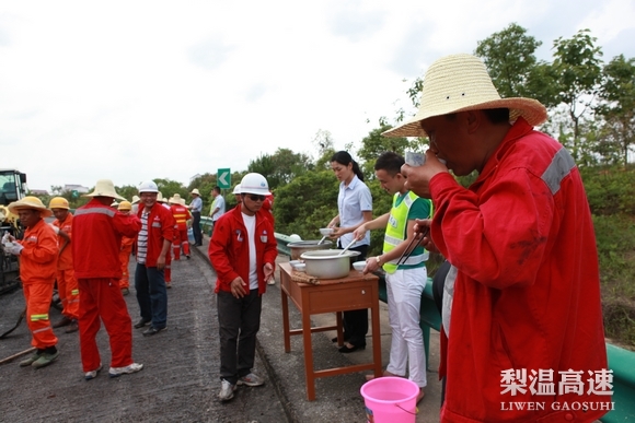在贵溪匝道,众多大型施工设备隆隆运转,车辆来回穿梭,一派热火朝天的施工场景。魏和仁赴施工现场,慰问一线作业人员,与施工管理人员深入交流,查看施工进度、质量和安全措施的落实情况。并安排为不顾高温酷暑奋战在一线的施工人员送去了绿豆汤等降温食品。