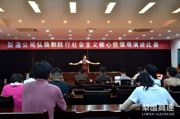 为喜迎党的生日,营造文明企业氛围。6月30日上午,梨温公司举办“弘扬和践行社会主义核心价值观”主题演讲比赛,来自公司6个代表队共12名选手参加了此次比赛。梨温公司副总经理邱国土、邓琼华出席观摩比赛,并为选手们演讲进行了点评和颁奖。