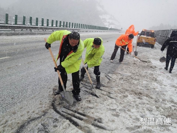 风大雪急时,白茫茫一片的梨温高速上,出现了一群群身影。只见他们纷纷打出梨温高速抗雪小分队、梨温高速党员先锋队、梨温高速团员志愿队等旗号,分散在5个不同路段进行快速人工铲雪,防止路面结冰。地上雪花积了一层,队员们就铲除它一层,天上雪片蒙了眼,就用衣袖拭去,几小时下来,全部人员鞋袜湿透,戚骨连心的冷,没有人喊累怕苦。