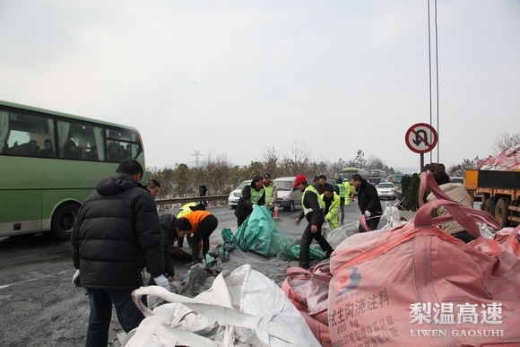 为确保受阻车辆能快速通行,他们积极与交警、路政排障部门沟通联系,及时组织本单位人员、设备协助救援工作。并现场督导实施应急处置。10时38分,2台大型起重吊车赶到现场,他们立刻协助指挥货车起吊,一面带领现场工作人员手工作业,清理路面散落的水泥包,一边安排人员维持交通安全秩序。经过一个半小时的奋战,单向受阻5个多小时的梨温高速恢复正常通行。