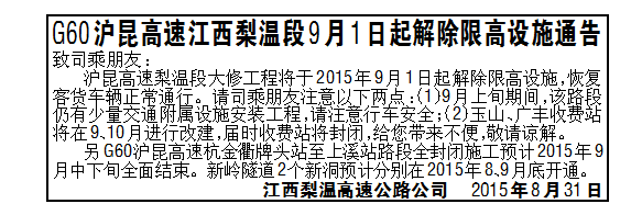 上一篇:关于沪昆高速梨温段路面专项工程上饶至鹰潭段施工期间分车型限制通行的通告