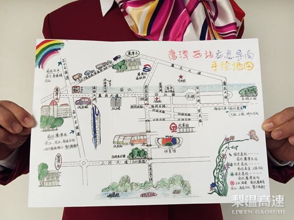 受大雾天气影响,车辆从鹰西站分流上、下高速时常发生,车道分流时会因为南来北往的司乘朋友会问路而影响通行速度,为解决这一难题,该站集思广益,最后决定以人工手绘分流图的方式,为司乘朋友绘制清晰直观的路线导向图。经过十多天的策划、布局、设计和绘制,鹰潭西站车辆分流导向地图成功绘制,该图以鹰西站、鹰东站、鹰南站、302国道、206国道及鹰潭市主要交通要道、城市建筑为主体,以绘制手工画的方式,清晰立体直观的勾勒出具体走向图,为司乘朋友指明主要要道方向,节约车道分流时司乘朋友的问路时间,提高了车道通行速度。
