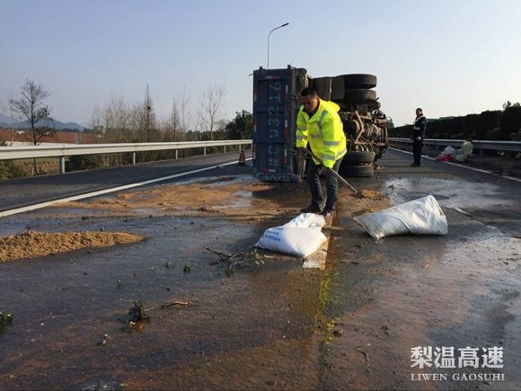 事发沪昆高速, 2月15日上午7时,一辆货车在撞击中央隔离带护栏后侧翻在了高速公路的主线上,破损油箱不断涌出大量柴油,现场一片狼藉。时值春运高峰期,源源而来的车流被这突发的情况惊扰的纷纷采取紧急制动避让事故车,一时间事故路段险象环生。