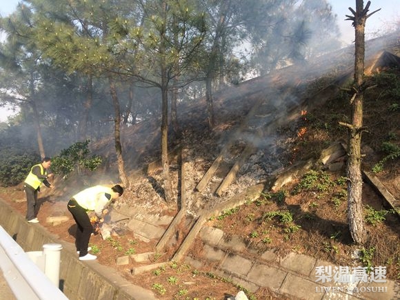 3月7日下午3时,梨温高速杨梅岭养护人员巡路至梨温高速上海方向532KM附近时发现火情,边坡草丛中冒出一股浓烟,风大火急,如果不及时扑灭就会导致更多的草皮、树木被烧毁,甚至会危及到高速公路的行车安全。
