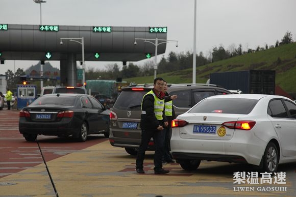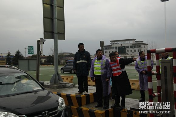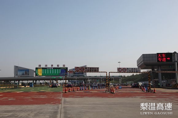 “声光电”保障法。声,四个高音扩放器,放置在广场150余米各处,不停播音:小车请进入专用车道,货车请进入超大车道……工作人员还配了四个手持式喇叭,形象的称这是“喊”春运……光,收费广场显示全部亮化。高杆灯,车道分流反光杆、临时收费指示反光牌。夜间灯火通明,照得整个收费仿佛是一个大生产车间……电,巨大LED电子显示屏,显示各种类型车进入方向,二百多米开外的车子都能看的清楚,起车流导向作用,为地方企业投资200余万支援的硬件设备。渠化分流法。春运之前,赣浙处在收费广场划出了区别车道,小车居中,大车靠右,同时设置限高栏杆,组织人员引导交通,组织车辆按导流渠方式行驶,一改以往混乱争抢状况。其中,交警人员给予充分协助,实现车行其道,据一名经过的李姓车主说,今年在梨园经过,感受最深的就是车辆通行明显井然有序了。