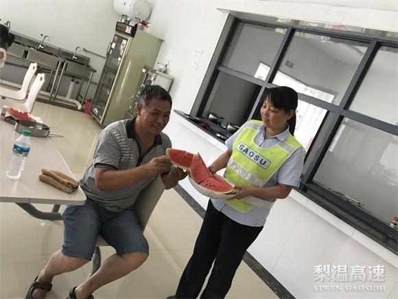 时值正午,烈日炎炎,车主一脸焦急的站在车旁,直冒汗。值班站长发现这一情况,主动上前询问车主,得知该车故障正在等待拖车,值班人员带车主来到接待室,并提供西瓜及矿泉水等清凉消暑物品,为车主提供清凉的避暑场所和解暑食品,下午三点拖车抵达,车主不停的感谢。