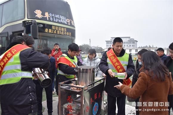 “师傅,辛苦了!要不要来一碗热腾腾的稀饭或一杯热开水?我们还准备了小菜、鸡蛋和馒头。”2月1日7点30分左右,正值春运,赣浙界梨园收费站广场上出现了一群青年志愿者服务队,给长时间滞留司乘送去了暖心的便民服务。