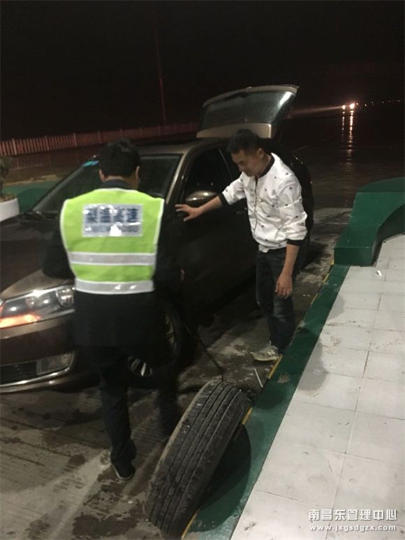 4月13日深夜,天空正下着瓢泼大雨,一辆黑色小车轮胎被扎,停靠在南昌南管理中心上饶经开区收费站出站口的路边,得到了当班收费员童木躲同志的热心帮助,司机这才得以更早更安全的返回家中。