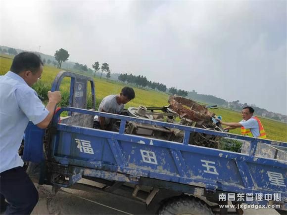 值班站长见状立即跑过去关切地询问道:“大叔,有没有受伤啊?您别急,我叫人来帮您。”值班站长马上叫来收费班长和行政人员一起上前去帮忙。农民大叔说,没有受伤,并解释三轮车右侧围栏没有关紧,这段路刚好是个大转弯,耕地机被甩出去了,连带着三轮车也翻倒在护栏上。
