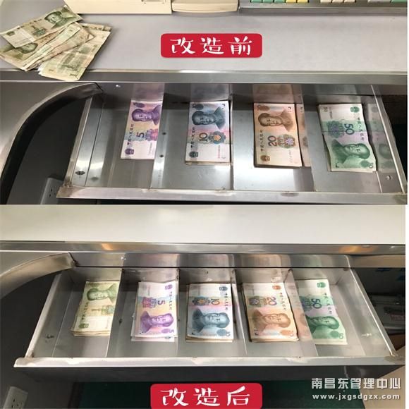 针对以前收费找零精确到5元,找零抽屉也只有4格,分别放置5元,10元,20元,50元纸币。在收费额精确到1元后,1元的纸币和硬币无处安放,只能放置在收费操作桌面。这很大程度上影响了收费台面的整洁度、收费准确率和收费速度。该站迅速行动起来,将找零抽屉进行四改五,把原本的三段隔板全部取出,重新精确测量,焊接四块铁板,将抽屉均分五个长方块,完美解决了1元零钱无处安放的问题。