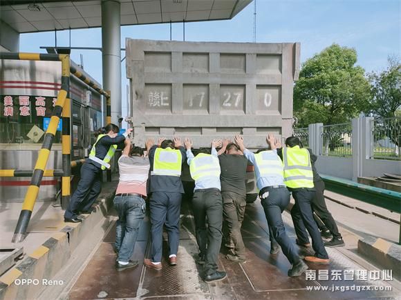 为了避免收费车道发生大面积拥堵,恢复正常收费秩序,杨梅岭收费站组织所有员工硬是把115轴的大货车推出了收费车道,恢复车道畅通。