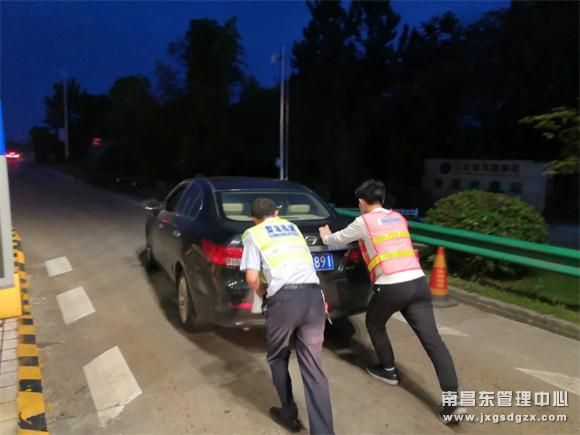 5月17日19点,正值收费站车流小高峰,一辆赣F牌照小型轿车熄火停在南昌南管理中心贵溪收费站出口4道。