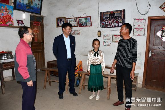 我们看望的第一个学生是9岁的刘雅馨。她的父母以前在外务工,一直跟爷爷奶奶在家,近两年父母为了照顾几个孩子,就在樟树务工,家里一个妹妹,一个弟弟。她爷爷说,雅馨在家里会主动分担家务事,很懂事,非常尊重老人和长辈,生活上非常爱干净,是弟弟妹妹的好榜样。