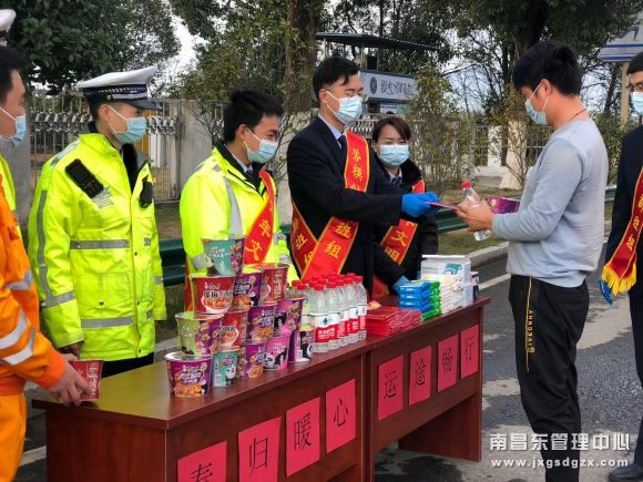 春运首日,该中心玉山收费所联同高速交警直属五支队第二大队、南昌南管理中心清障救援队玉山中队组织开展了“春归暖心、护航春运”一系列主题春运保畅活动。所属收费站通过设立服务点、发放春运交通安全宣传资料,向过往司乘讲解交通安全出行常识,提醒车主严格遵守道路交通法律法规、安全文明出行。他们设立春运便民服务台,为司乘人员赠送防疫物资、春节红包、纸巾等小礼品,免费为过往司乘提供矿泉水、方便面,将准备好的红糖姜茶,一杯杯递到司乘人员手中。