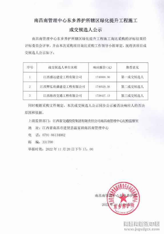 南昌南管理中心东乡养护所辖区绿化提升工程施工询比采购成交候选人公示