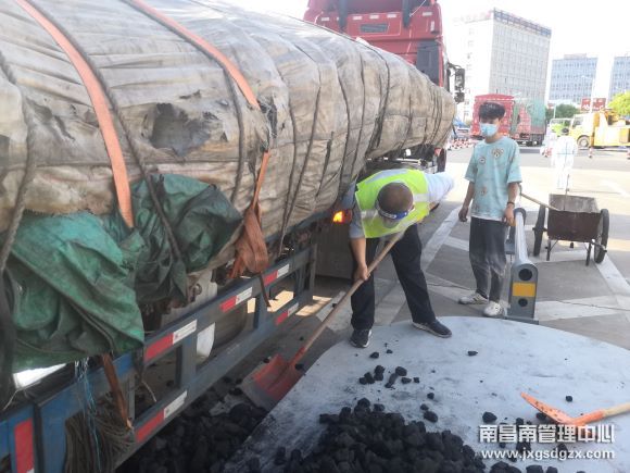 近日,一辆皖籍大型货车从南昌南管理中心上饶西收费站下高速时,因倒车过程中车辆篷布被刮破,装载的煤炭洒落一地,正当驾驶员一筹莫展之时,该站收费员立即赶到现场相助。