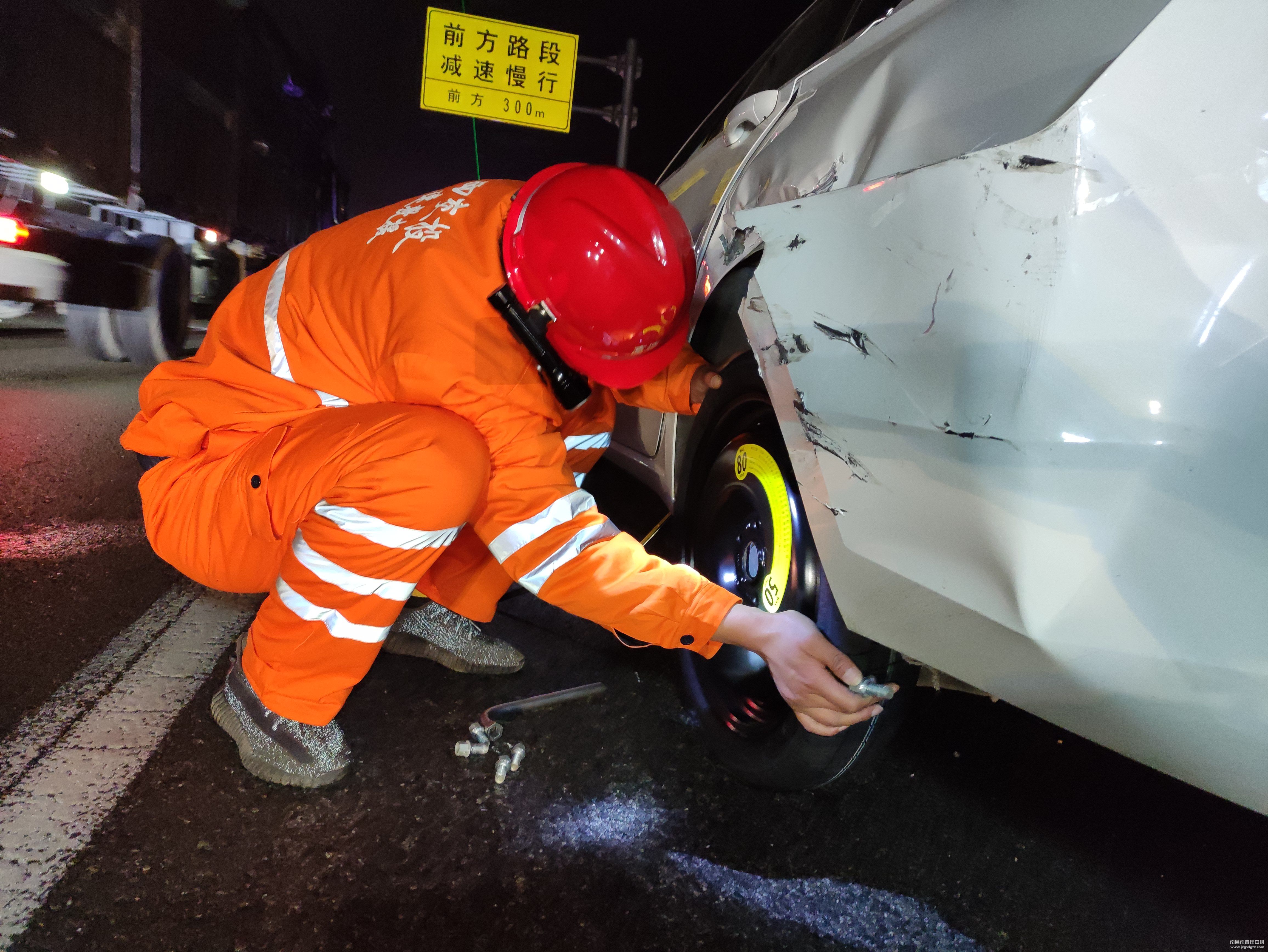 经现场检查,有两辆小车需要拖走,一辆小车能正常行驶,一辆小车需要更换左后轮胎。为了尽快疏通道路,柏杨先同队员用手将另外两辆车推至应急车道,再将需要换胎的小车移至应急车道,熟练地拿起工具,5分钟便将备胎换上。十几分钟后,救援人员也抵达现场,迅速将两辆小车拖离事故现场,至此,双向车道恢复正常通行。