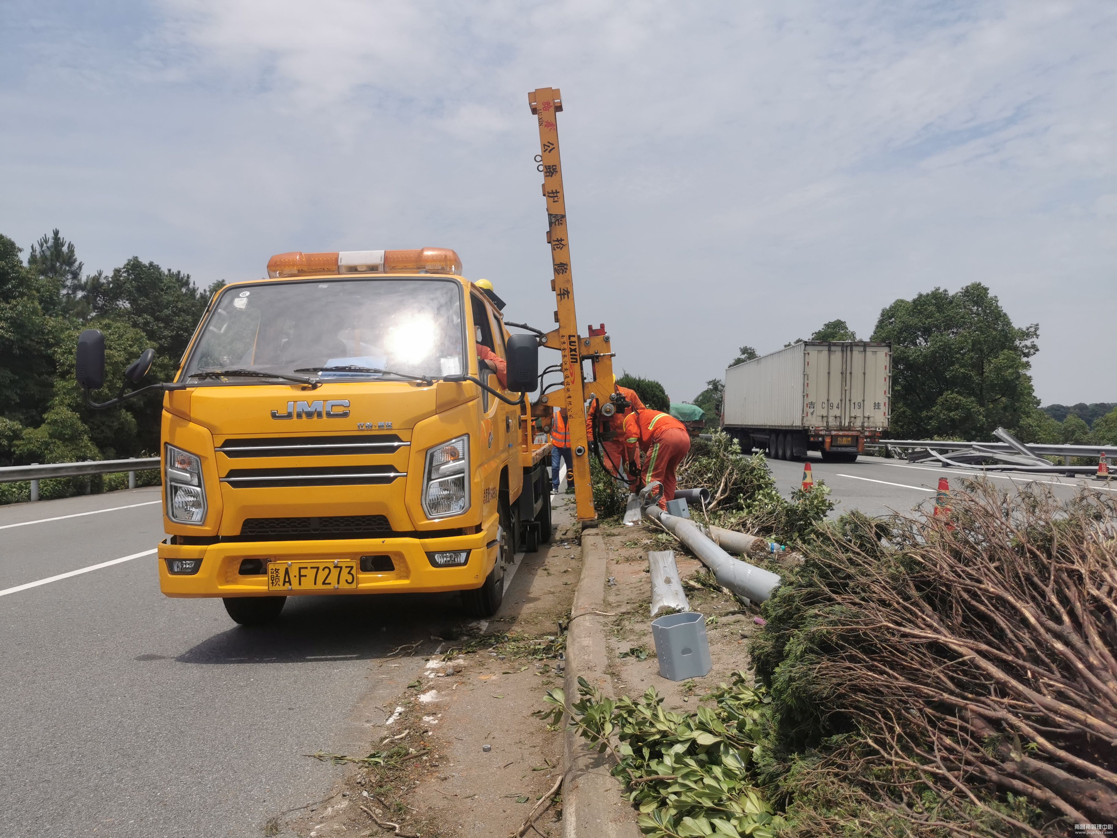 6月8日上午8点左右,在沪昆高速K581南昌方向发生一起交通事故,一辆厢式半挂车撞上高速公路护栏导致中分带护栏立柱和外侧护栏立柱全部撞毁,损坏的碎片散落一地,现场存在严重的安全隐患。东乡养护所交安设施维修队接到报警电话后第一时间安排两组施工队伍同时赶赴现场。