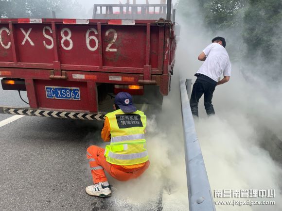当日,余江中队中队长张永义和救援员刚处理完一起侧翻事故后,从K688前往温家圳调头返回单位,途径K695时,张永义发现前面一辆货车在行驶途中右后车轮冒出浓烈的黑烟,货车驾驶员并未发觉,情况十分紧急。张永义立即拉响警报,利用喊话器示意驾驶员赶紧靠边停车,停车后他拿起灭火器和车上备用应急水对起火部位进行灭火。5分钟后,火情得到了有效控制,为了确保车辆安全,他们在现场等候,观察了15分钟。