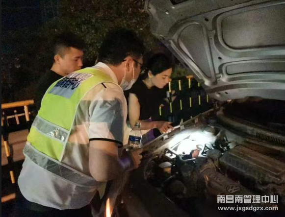当班班长到达现场第一时间将车辆引导至入口广场安全地带,并在车辆后方摆好反光锥,做好安全警示标志后立即对车辆进行检查,经过一系列的排查,发现车辆由于水箱漏水导致发动机温度过高,不能继续行驶。随后用水桶取来水源,帮司机装满水箱。
