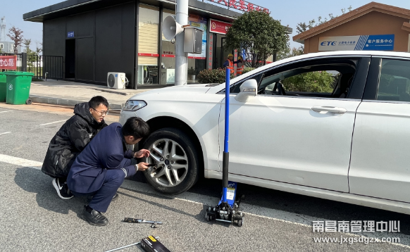 11月14日,南昌南收费站工作人员化身“修车能手”,帮助司机顺利换上轮胎获称赞。