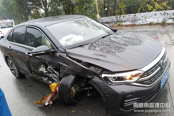12月11日,一辆赣E车照小轿车,因大雨导致视线不佳,撞上了分路蹲,气囊弹出,情况紧急。随后在南昌南管理中心玉山站收费暖心小哥的帮助下,也很快脱困。