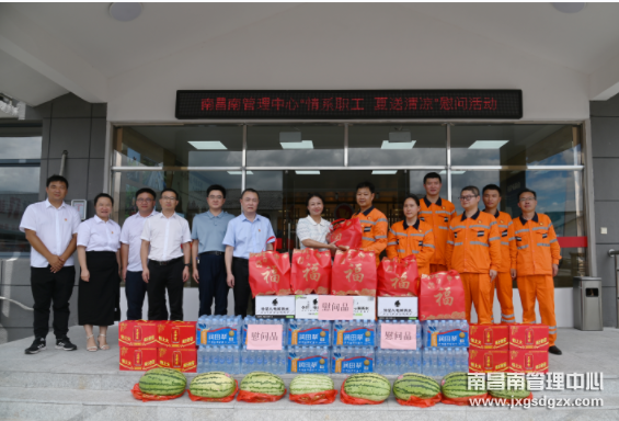 7月31日,南昌南管理中心党委书记陈苏华到罗湖养护站开展送清凉慰问。党委副书记、纪委书记雷霆,党委委员、副总经理章龙俊、祝谭雍一同慰问。为一线员工送上西瓜、凉茶、矿泉水、藿香正气水等防暑降温食品用品。