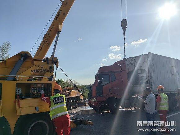 当天15时左右,鹰潭救援中队值班人员接到救援电话后立即组织人员、设备赶赴现场。15时20分救援人员到达现场并立即做好安全围蔽。经了解,事故冷藏集装箱半挂车在行驶过程中,因前方一辆四米二的货车故障停至行车道,其躲避不及时,造成车辆追尾并冲出高速。“车上拉的是冷藏水果,需要尽快拖下高速进行冷藏转运。”司机神情着急地告诉救援人员。救援人员在查看好现场情况后,立即开展救援,启用吊车将事故车辆起吊至高速公路行车道,并将事故车辆固定好拖离现场。